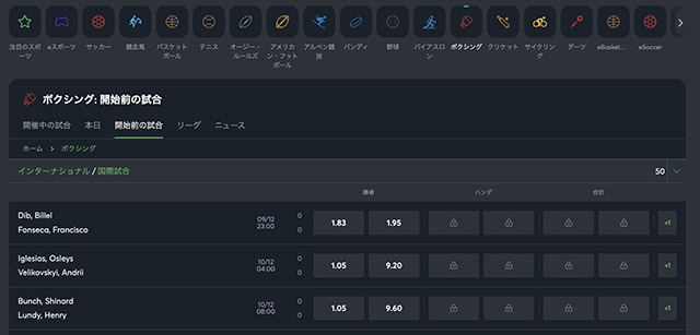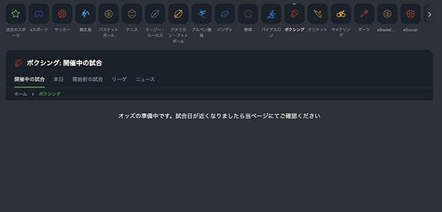 ボクシングを選択したら、上部にあるタブから「開始前の試合」をクリックすると、事前ベットできる試合一覧をソートしてください。