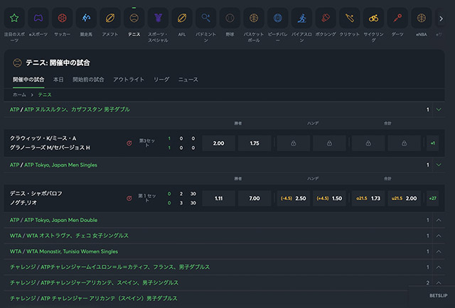 そして、スポーツ一覧からテニスをクリックして、「開催中の試合」タブをクリックします。