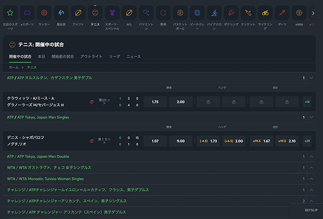 ログインが完了したら、上部のアイコンより「テニス」をクリックしてください。すると、ベット可能な試合の一覧が表示されます。