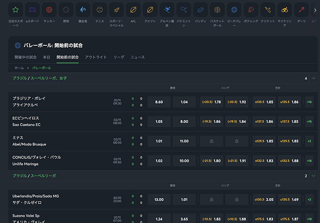 あとは、ベットしたい試合とベット方法を選択してベットします。なお、上記例ではブラジルスーペルリーガの試合を2日前からベットでき、1×2とハンデ、合計がベット対象となります。