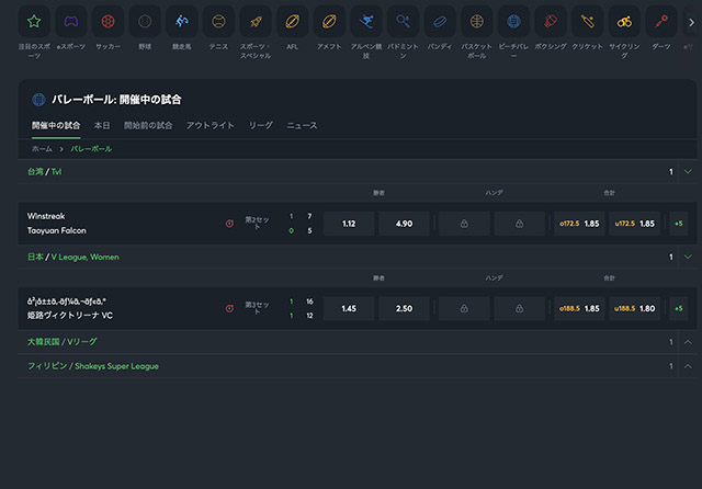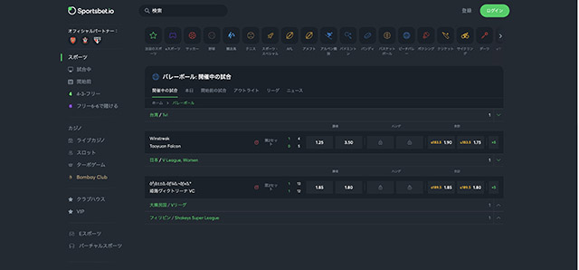 ログインが完了したら、上部のアイコンより「バレーボール」をクリックします。すると、ベットできる試合の一覧が表示されます。